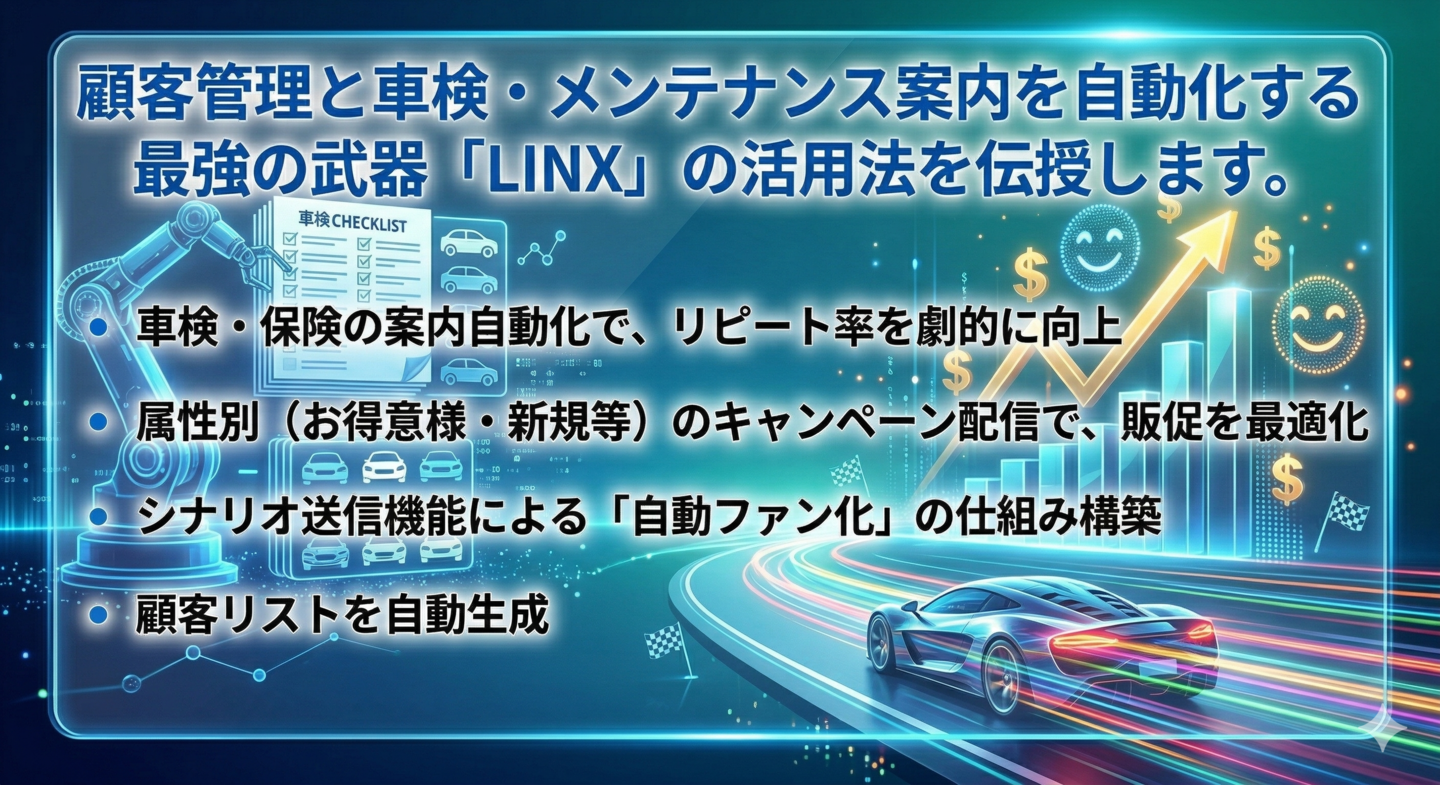 顧客管理と車検・メンテナンス案内を自動化する最強の武器「LINX」の活用法を伝授します。