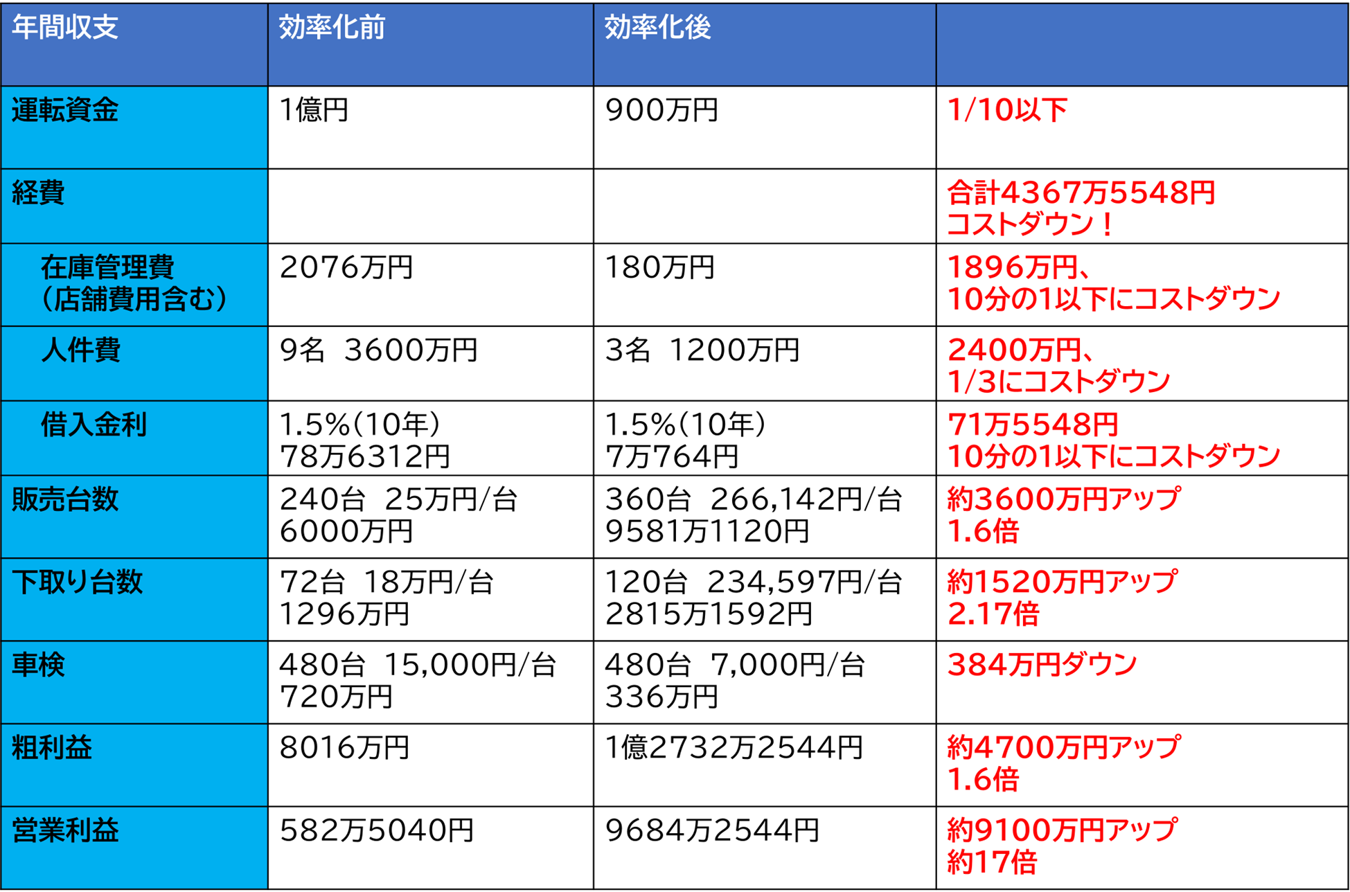 皆さんが同じように変えられると言う訳にはいかないと思いますが、Hカーセールスはこれらを変えることで飛躍的に超高収益企業(利益17倍!)へと変身を遂げました。